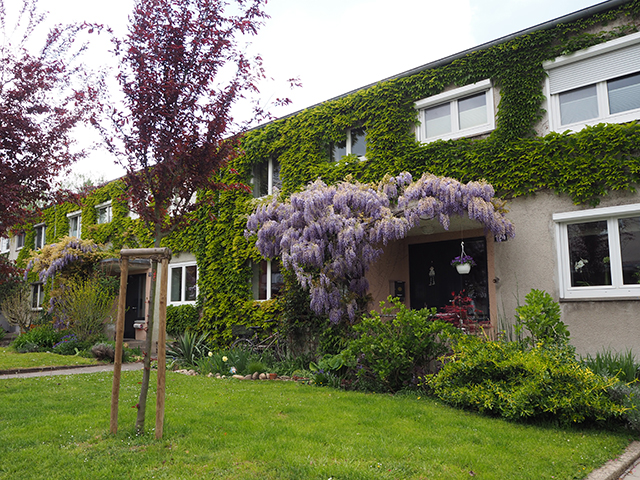 フランクフルト北西部のレーマーシュタット団地は、ニダ川の谷筋全体の景観づくりにも配慮され、団地内には、店舗、保育園、共同洗濯場、コミュニティーセンター、遊び場、宿泊施設、学校そして劇場まで備えられている。80年も前に建てられた集合住宅がいまでも好評で、かなりの空き待ち状態であるという。住宅は小さいが総地下で2階建て、190㎡の専用庭付きである。