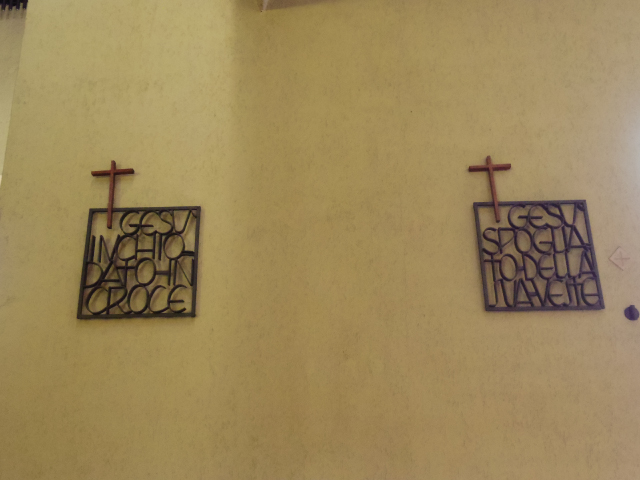 ジオ・ポンティの傑作でもある聖フランチェスコ教会は、背景の青空も取り入れた前面の魅力的なデザインが左右の住宅と一体化している。六角形はジオ・ポンティの言葉(建築は結晶である)そのもの。荘厳ではないが明るく日常的でシンプルな内部空間。教会などによく見られるキリストの一生などを絵や彫刻で描いたものの代わりに、デザインされた文字(ロゴ)による文章表記の鉄の板も印象的だ。