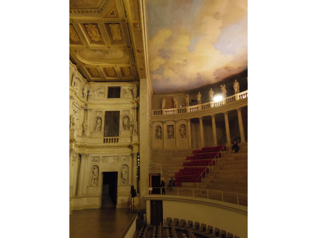 城(13世紀)の中庭に作られた世界初の屋内劇場、テアトロ・オリンピコは、ローマの野外劇場を模したパラディオによる建築物であるが、舞台には古代ギリシャのテーベの街路が遠近法を用いて作られている(初演が、テーベの王の物語「オイディプス」だった)。なお、客席背後の見事な彫像群は木と漆喰の言わば張りぼてである。