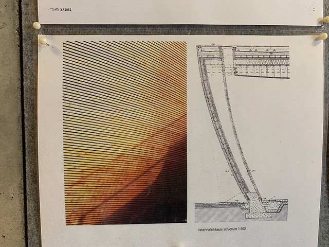 カンピ礼拝堂は繁華街の真ん中に立つ宇宙船のような不思議な建物。もみの木を「曲げわっぱ」のように曲げて作られた外観。高さ11.5メートルのホール内部を支えるセイヨウヤマハンノキが隙間からの自然光に照らされてぬくもりを感じさせる。宗教行事は行われず、人々が祈りを捧げる場所。